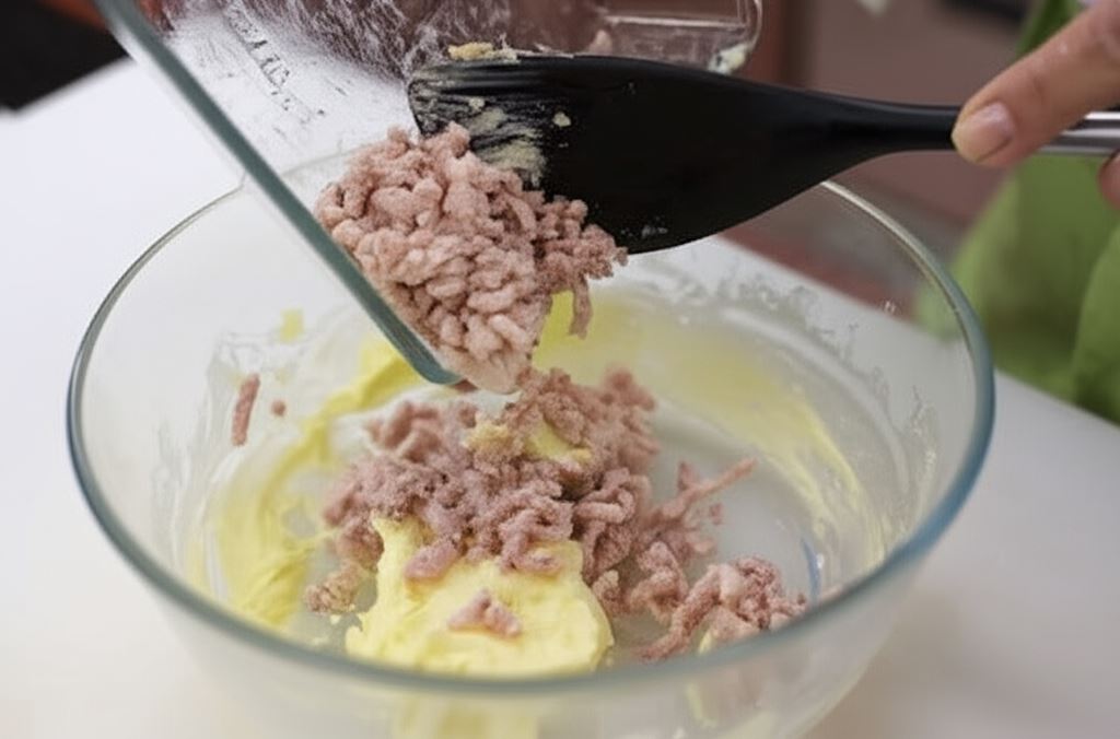 Boczek zmiel, a ser żółty zetrzyj na tarce o grubych oczkach. Pozostałe masło utrzyj. Mieszając powoli dodawaj zmielony boczek.