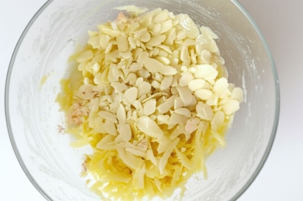 Zachowaj część startego sera i płatków migdałowych do posypania, a pozostałą ilość wsyp do ucieranej masy.