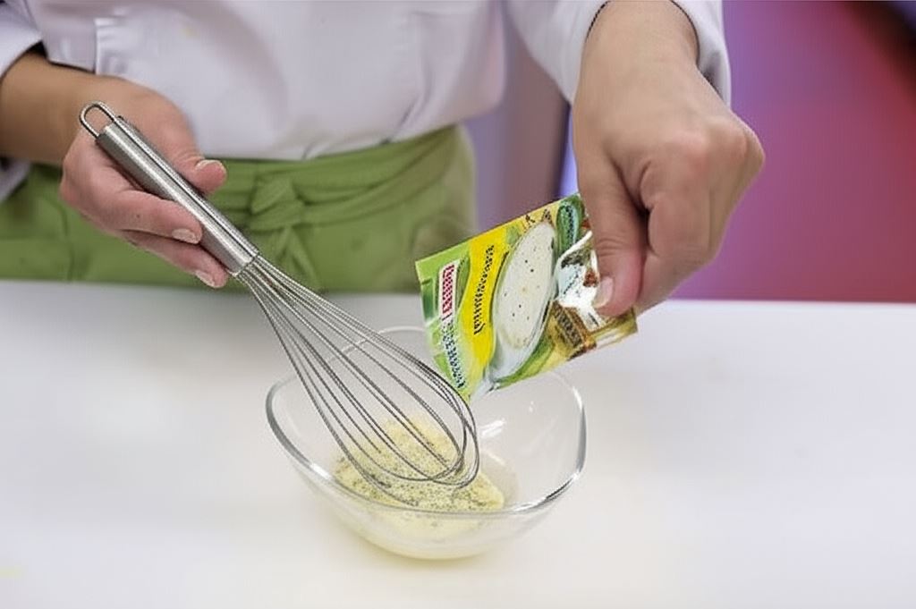 Sos czosnkowy sałatkowy Knorr połącz z majonezem i 2 łyżkami wody, serwuj do przygotowanej przekąski.