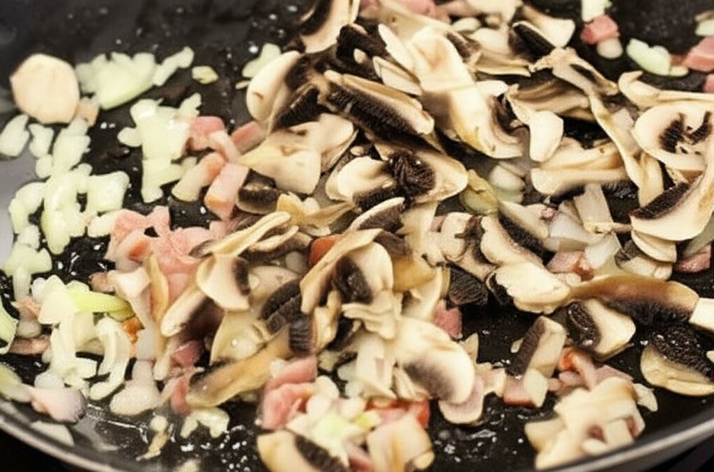 Pieczarki posiekaj drobno, wsyp do boczku i smaż razem 10 minut.