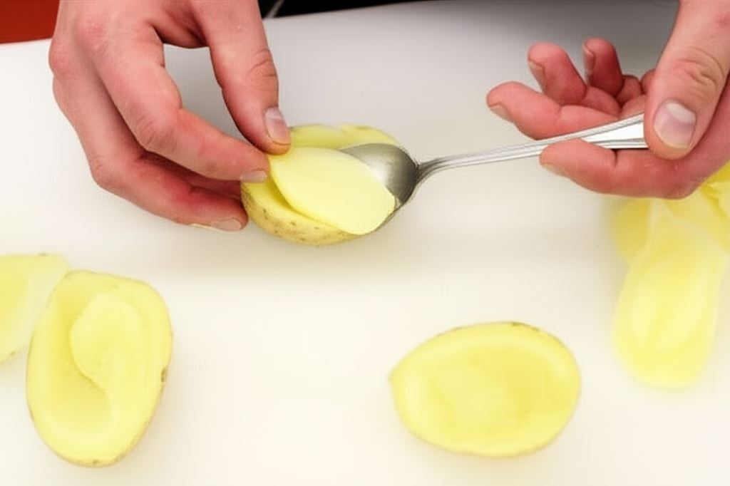Nieco przestudzone ziemniaki przetnij na pół i za pomocą łyżeczki wydrąż wnętrze. Skórka powinna mieć około ½ centymetra grubości.