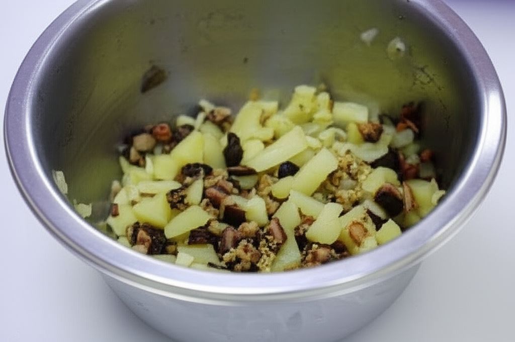 W misce połącz pozostałości po drążeniu ziemniaków, pieczarki z boczkiem i wszystko przypraw kostkami Knorr.