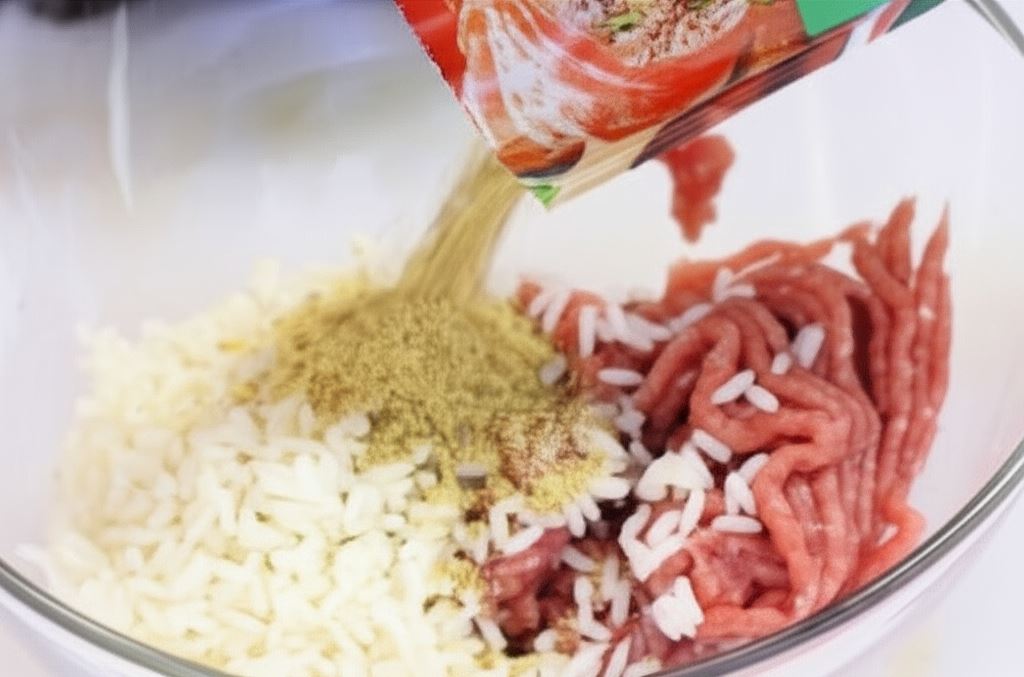 Mięso mielone umieść w misce, wsyp ugotowany ryż oraz Fix Knorr i połącz składniki.