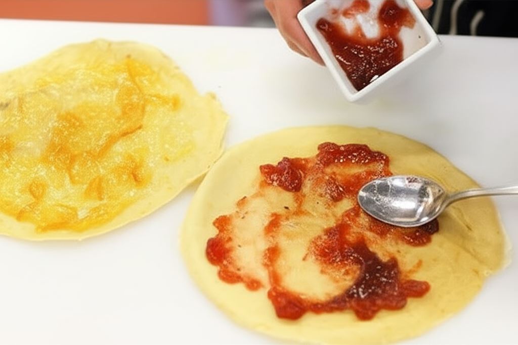 Przygotuj 2 naleśniki – pierwszy posmaruj dżemem truskawkowym, a drugi dżemem pomarańczowym.