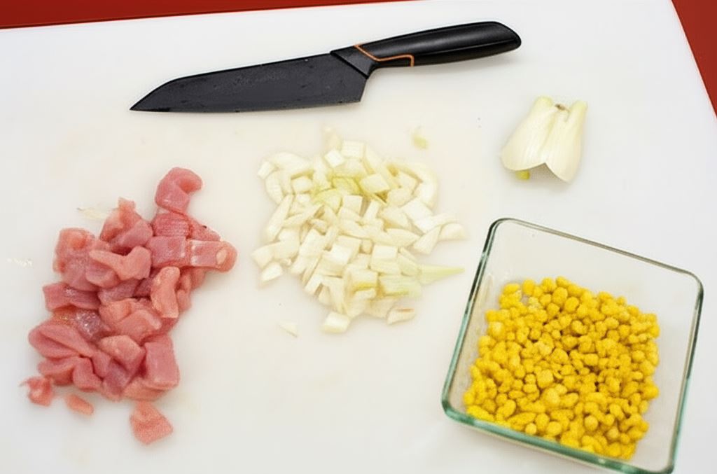 Kurczaka opłucz i potnij w kostkę, koper włoski również pokrój w kostkę, a kukurydzę odcedź.