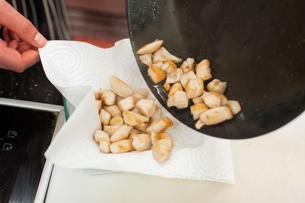 Usmaż kurczaka na patelni i osusz na ręczniku papierowym z nadmiaru tłuszczu.