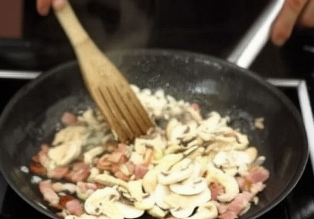 Obsmaż na patelni kurczaka, potem dodaj cebulę i czosnek. Po 1 minucie wsyp pieczarki.