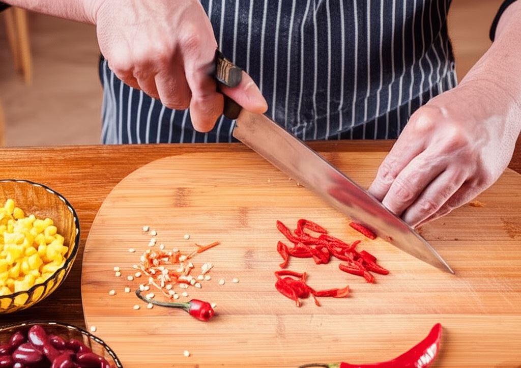 Paprykę chili posiekaj w cienkie paski bez nasion, kukurydzę i fasolę odcedź.