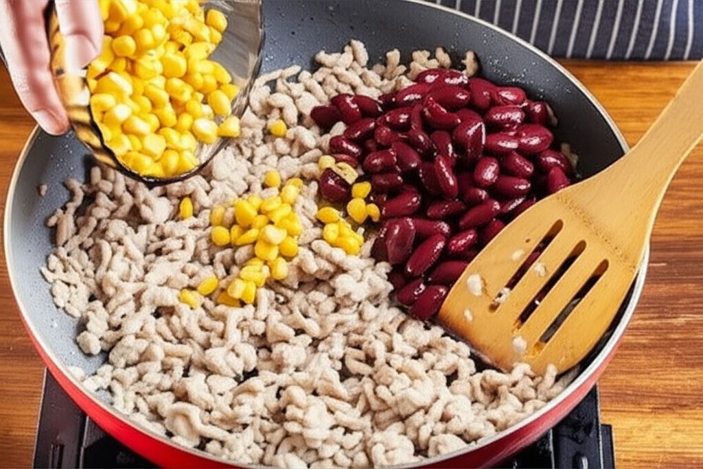Na patelni podsmażaj mięso, wsyp kukurydzę, fasolę, papryczkę chili i, smaż 5 min i wsyp rozdrobnione pomidorki pelati, przypraw solą i pieprzem. Gotuj na niskim ogniu 15 min.