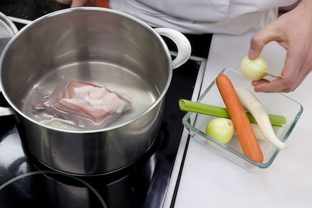 Mięso opłucz, zalej wrzącą wodą i gotuj pod pokrywką. Warzywa oczyść, opłucz, obierz i dorzuć pod koniec gotowania do mięsa.