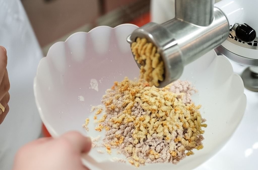 Wyjmij ugotowane mięso z warzywami z wywaru, poczekaj aż ostygnie i przepuść przez maszynkę do mielenia mięsa.