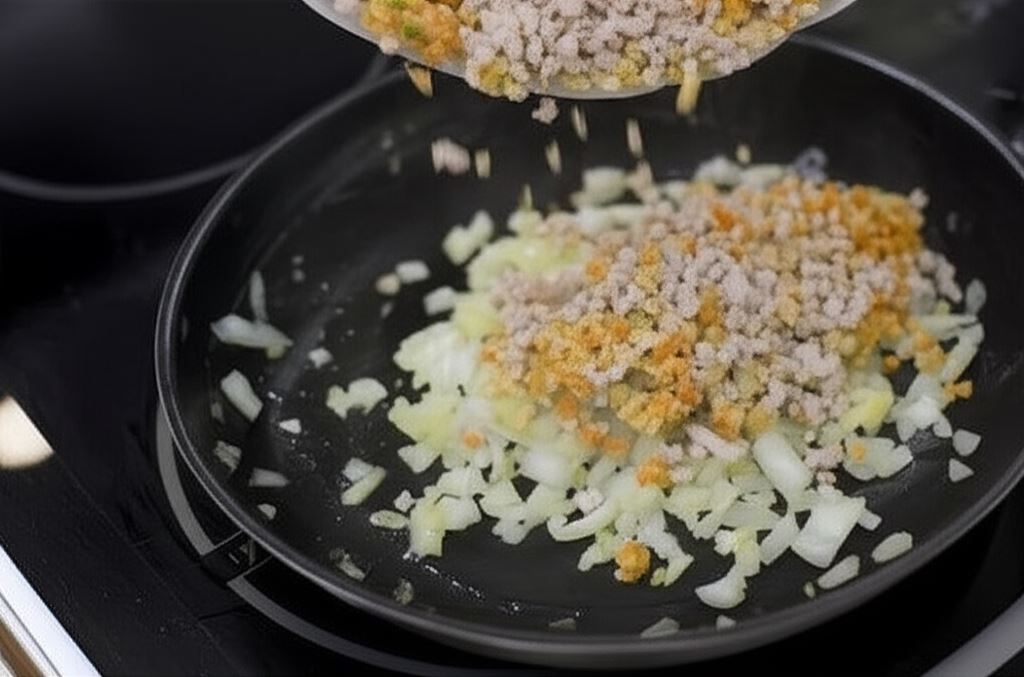 Fix Knorr połącz w szklance wody i dodaj do mięsa. Dokładnie zamieszaj. Całość duś, aż farsz stanie się gęsty i cała ciecz wyparuje.