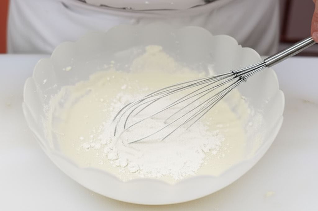 Przesiej mąkę do naczynia, wlej mleko, wodę, dodaj jajko, sól i całość wymieszaj na jednolitą masę.