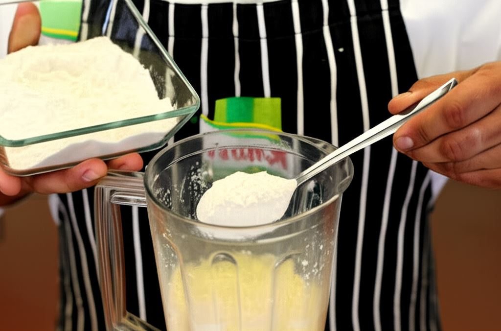 Przy użyciu blendera zmiksuj mleko z jajkami i miękką margaryną. Potem połącz z mąką aż do uzyskania jednolitej konsystencji.