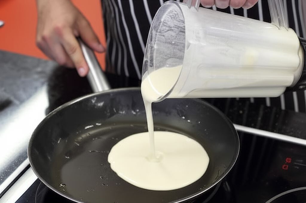 Wlewaj porcje ciasta na nagrzaną patelnię z olejem. Smaż naleśniki po obu stronach.