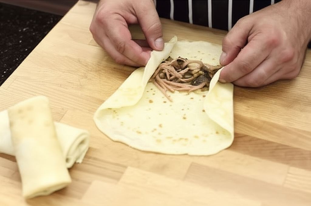 Kluczem do idealnych naleśników jest dokładne wymieszanie ciasta na jednolitą masę – dzięki temu będzie się równomiernie rozprowadzać na patelni. Aby nadzienie nie wypadało, warto zawinąć naleśniki w formę krokietów.
