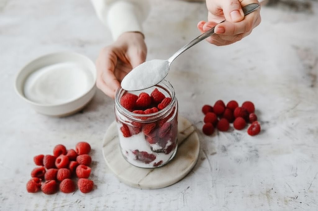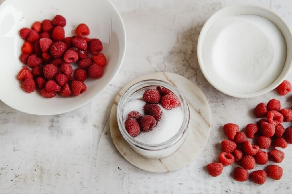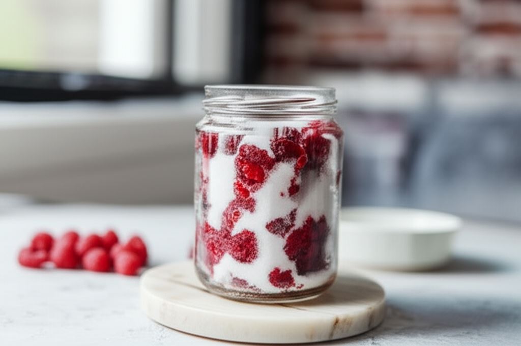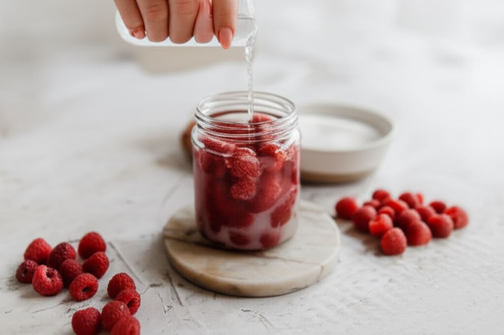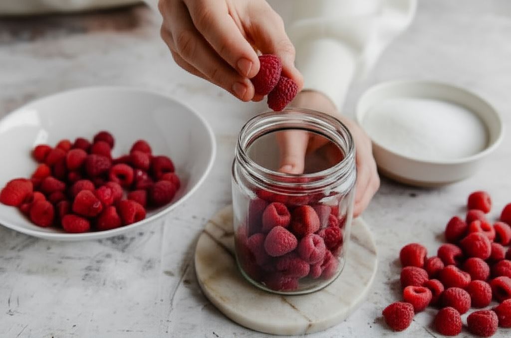 Maliny ostrożnie płuczemy i usuwamy szypułki. Umieszczamy pierwszą porcję w słoiku.