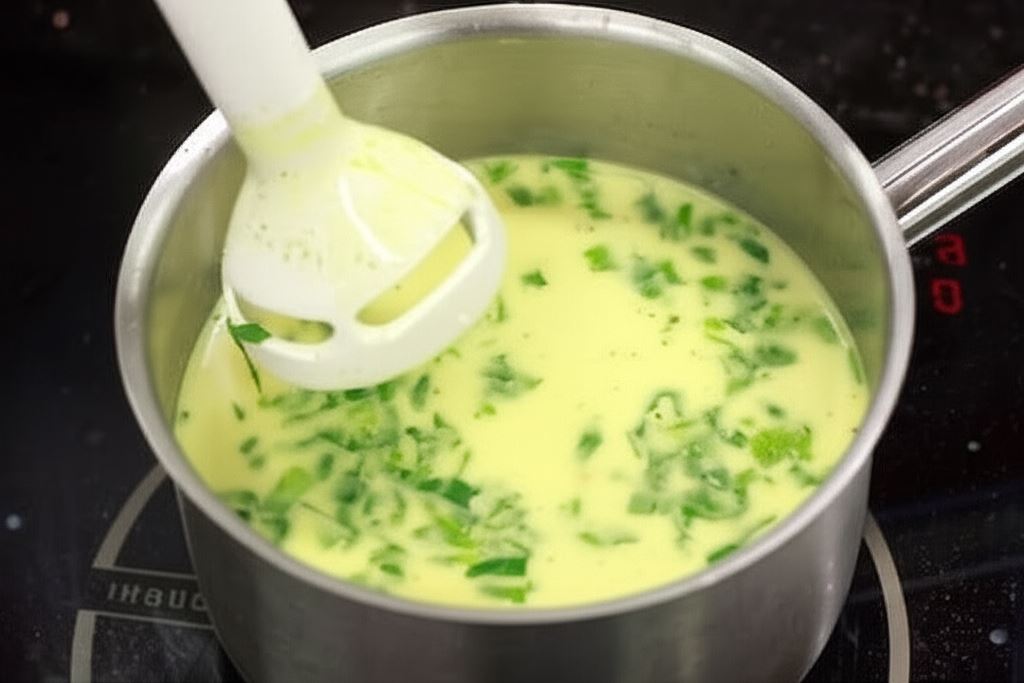 Umieść serki topione i ogrzewaj na niskim ogniu aż się rozpuszczą. Zmiksuj je blenderem na drobno.