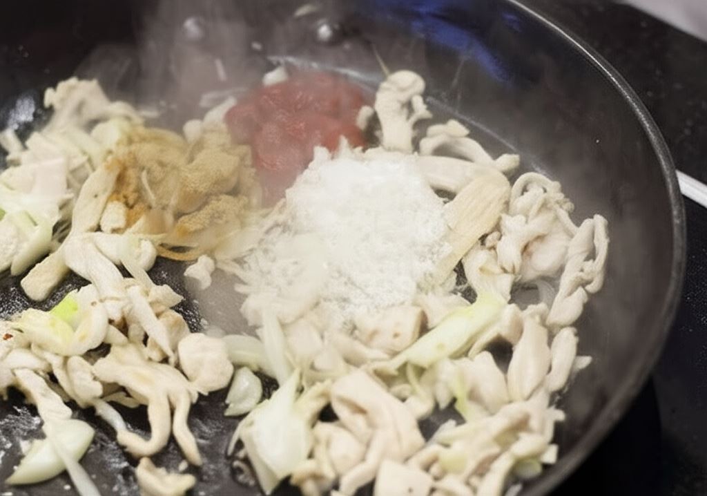 Mięso oraz cebulę potnij na bardzo cienkie paski, przysmaż na patelni, wsyp imbir, czosnek, kokosowe wiórki, dodaj ketchup.