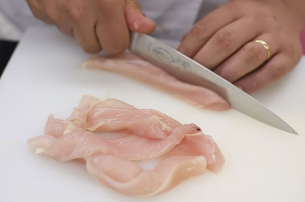 Potem przygotuj 400 gramów piersi kurczaka. Umyj mięso pod bieżącą wodą i wysusz papierowym ręcznikiem. Pokrój je ukośnie w małe plastry. Każdy kawałek kurczaka zamocz w jajku wymieszanym z mlekiem i obtocz obustronnie w panierce.