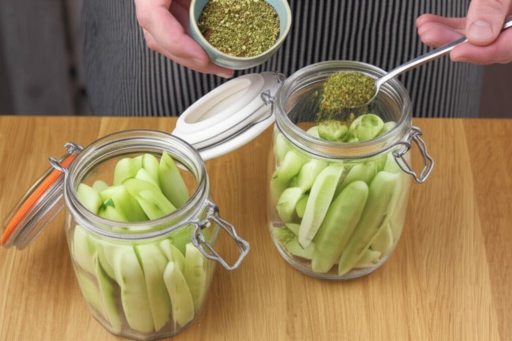 Ogórki opłucz, zdejmij skórkę, potnij na ćwiartki i włóż do słoików. Do każdego słoika dodaj po ½ łyżeczki przyprawy Knorr.