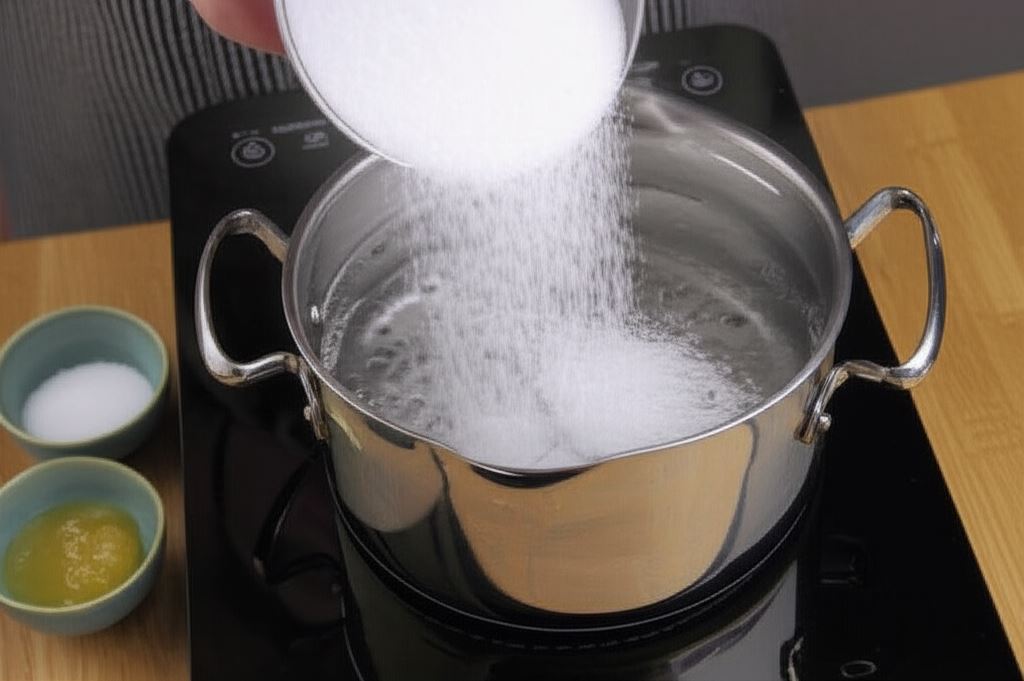 W garnku doprowadź wodę do wrzenia, potem wsyp sól, cukier, miód i dokładnie zamieszaj.