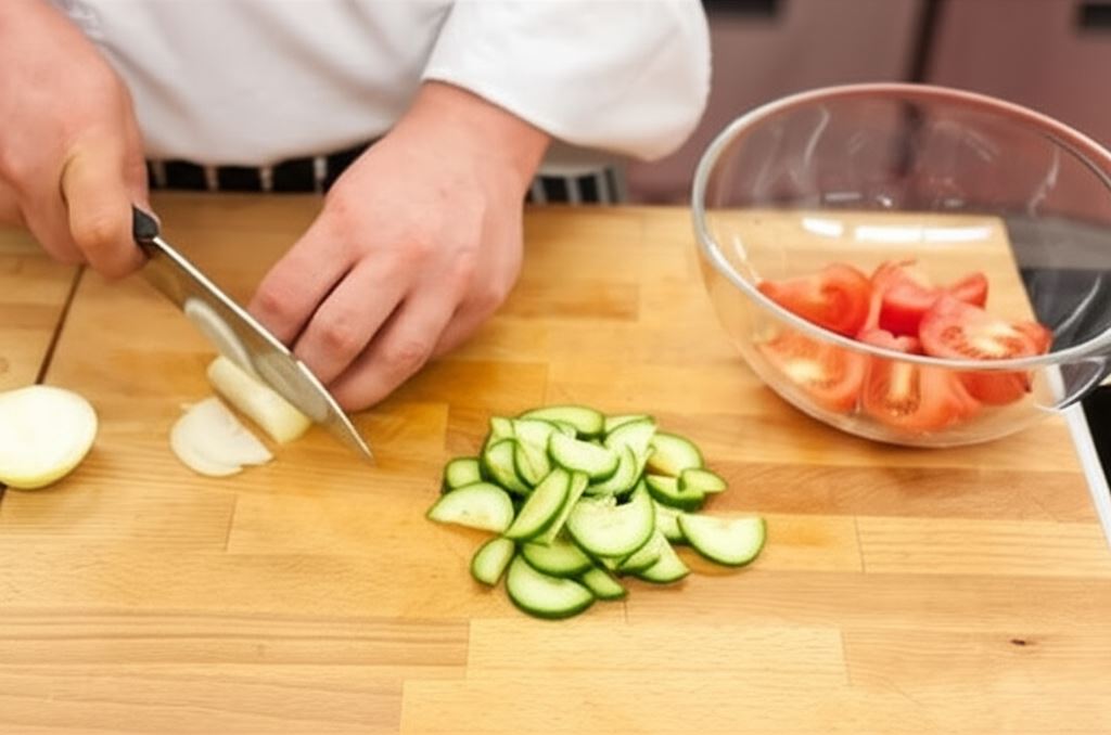 Warzywa opłucz, a potem pokrój – pomidory w ósemki, ogórki w półplastry, a cebulę w piórka.