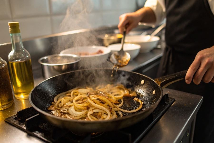 Profesjonalny trik polega na kontroli temperatury – rozpoczęcie smażenia na średnio-wysokim ogniu (180-200°C) dla szybkiego odparowania wilgoci, a następnie redukcja do średniego (150-170°C) dla właściwej karmelizacji bez przypalenia. Równomierne pokrojenie cebuli zapewnia jednolite smażenie, a dodanie szczypty soli na początku procesu pomaga wydobyć wilgoć i przyspiesza karmelizację.
