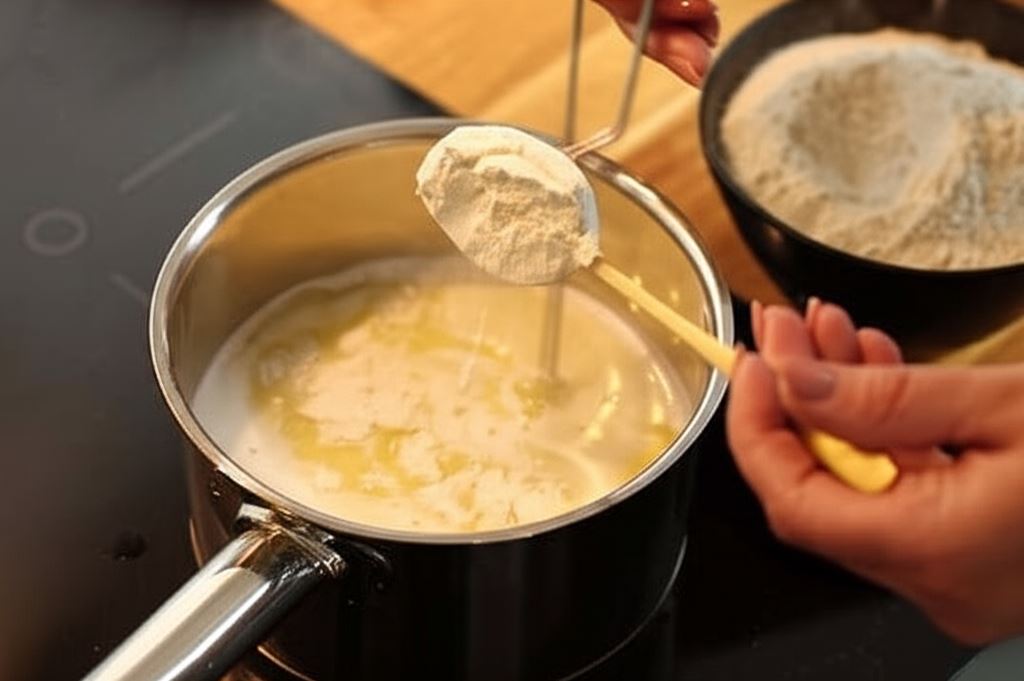 W garnku doprowadź do wrzenia wodę z masłem i odrobiną soli. Kiedy masło się roztopi wsyp mąkę i gotuj przez moment. Odłóż do ostygnięcia.