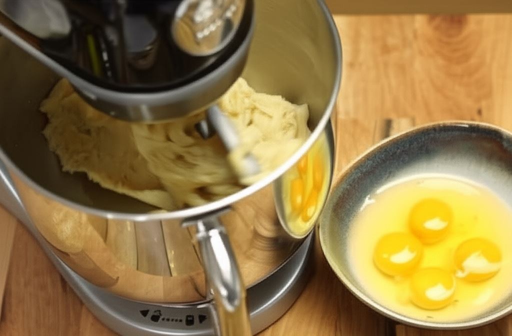 Zimną masę umieść w misie robota kuchennego i rozpocznij wyrabianie ciasta dodając jajka jedno po drugim.