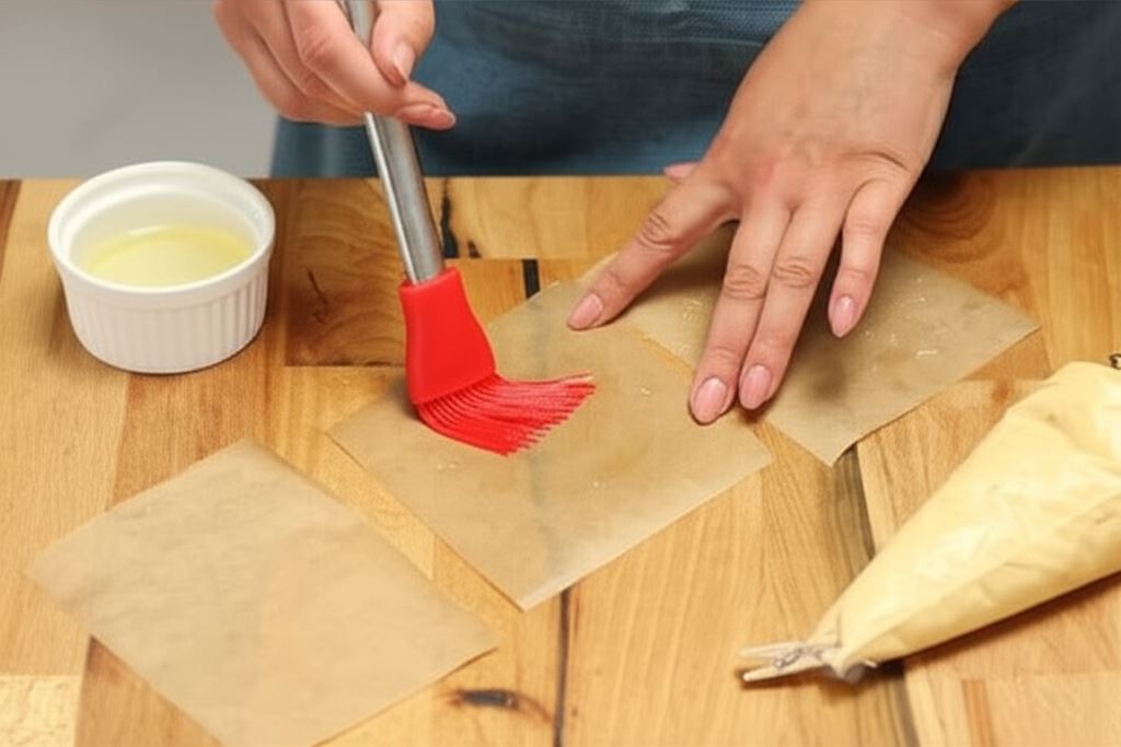 Umieść farsz w szprycy cukierniczej. Z papieru pergaminowego wytnij kwadraty o wymiarze około 10 cm i nasmaruj je olejem.