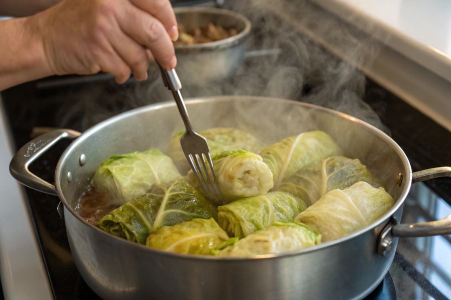 - Blanszowanie liści kapusty przed zawijaniem (3-5 minut we wrzącej wodzie)