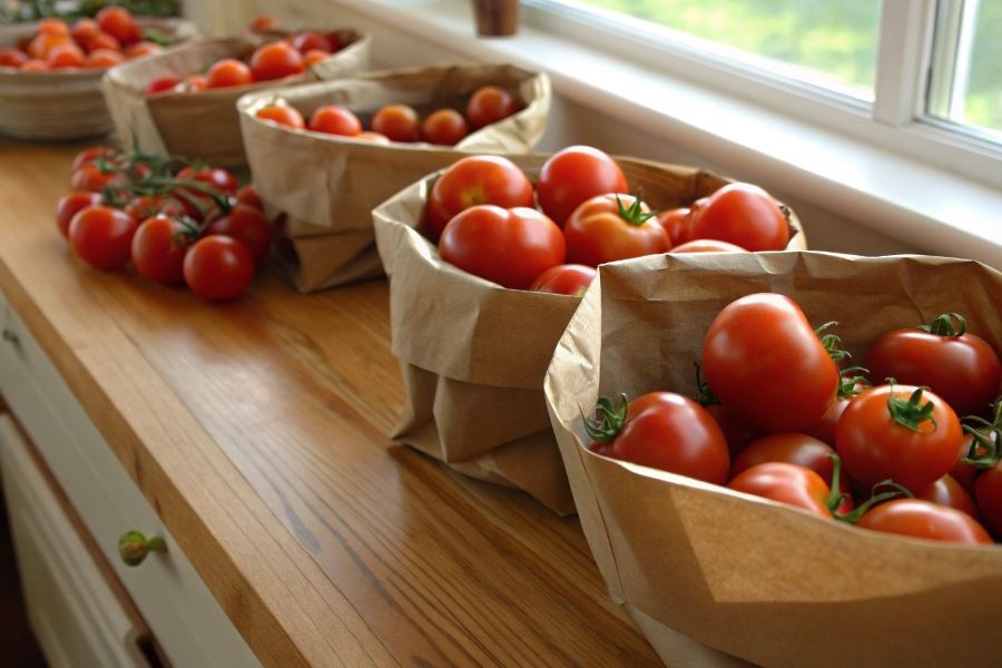 - Niedojrzałe pomidory – najlepiej przechowywać w temperaturze pokojowej (18-21°C), umieszczając je w papierowej torbie razem z dojrzałym jabłkiem lub bananem, które uwalniają etylen przyspieszający dojrzewanie