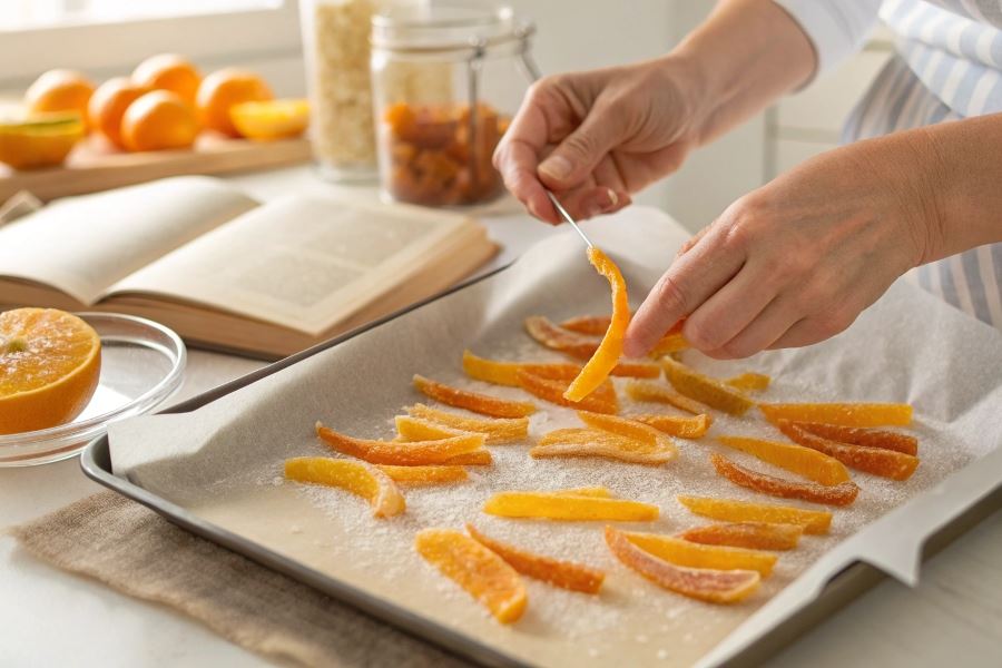 Prawidłowo skrystalizowane skórki powinny być lekko elastyczne, z widoczną warstwą cukru na powierzchni, gotowe do wykorzystania w świątecznych wypiekach.