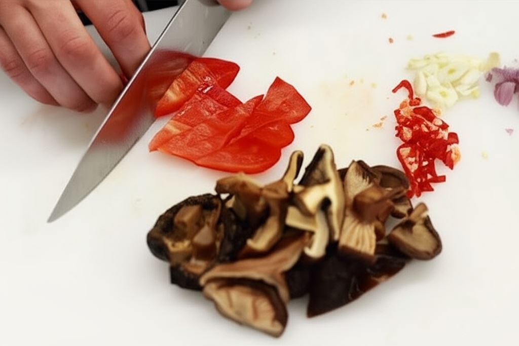 Grzyby zalej wrzątkiem, odstaw na 15 minut, a kiedy staną się jędrne przekrój je na połówki. Jeśli korzystasz z pieczarek pokrój świeże grzyby bez moczenia. Paprykę pokrój w plasterki.