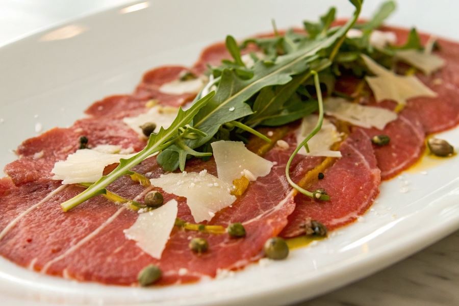 Carpaccio to wykwintne danie kuchni włoskiej składające się z niezwykle cienko pokrojonych plastrów surowej wołowiny, podawanych najczęściej z dodatkiem sosu, parmezanu i rukoli. Nazwa tej potrawy nie jest przypadkowa – została nadana na cześć weneckiego malarza Vittore Carpaccio, słynącego z intensywnych czerwonych barw w swoich dziełach, które przypominały kolor surowej wołowiny.
