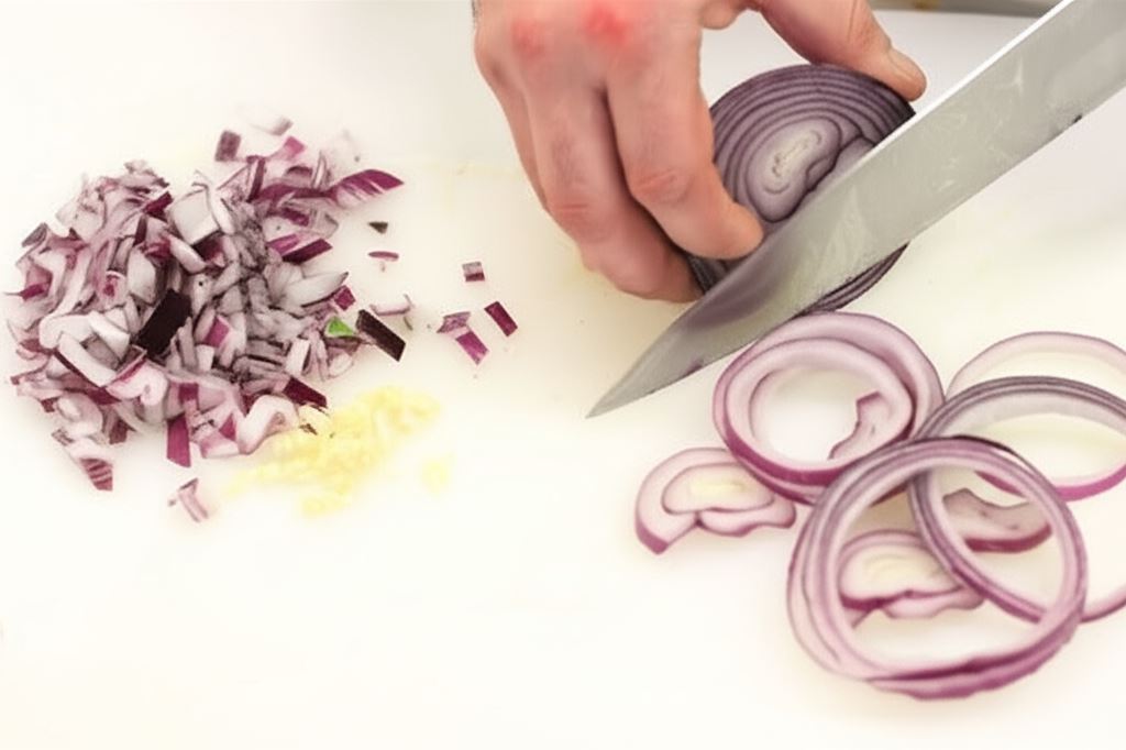 Połowę cebuli pokrój w krążki tak, by utworzyły pierścienie i zostaw do dekoracji. Resztę, razem z czosnkiem posiekaj na drobną kostkę.