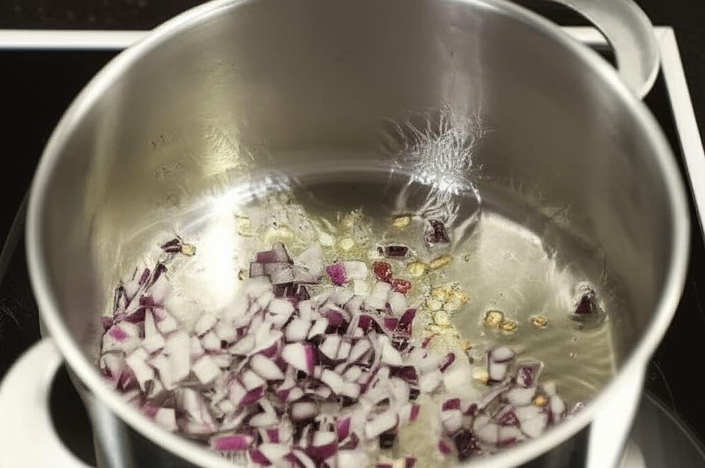 W szerokim rondlu podgrzej oliwę i zrumień cebulę i czosnek.