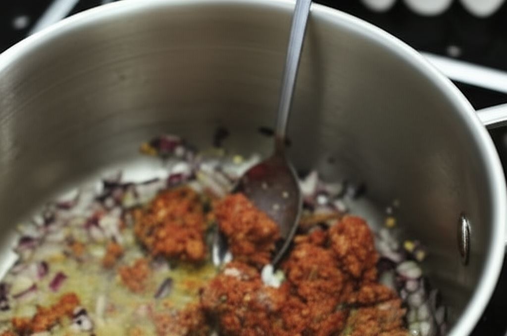 Wrzuć teraz posiekane pomidory z puszki oraz pół szklanki wody. Całość duś przez około 20 minut, aż porządnie zgęstnieje. Na końcu duszenia dodaj odcedzoną czerwoną fasolę.