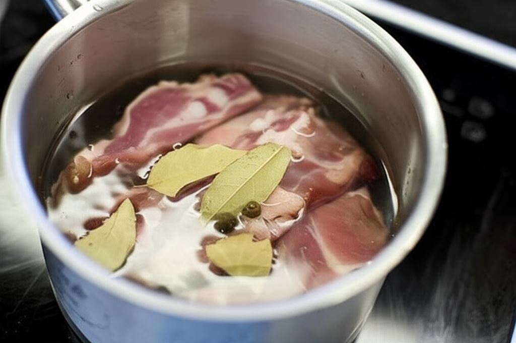 Mięso podziel na porcje (na przykład po 2,3 kawałki) i zalej wodą. Wsyp sól, liść laurowy i ziele angielskie. Mięso gotuj na wolnym ogniu, aż stanie się miękkie.
