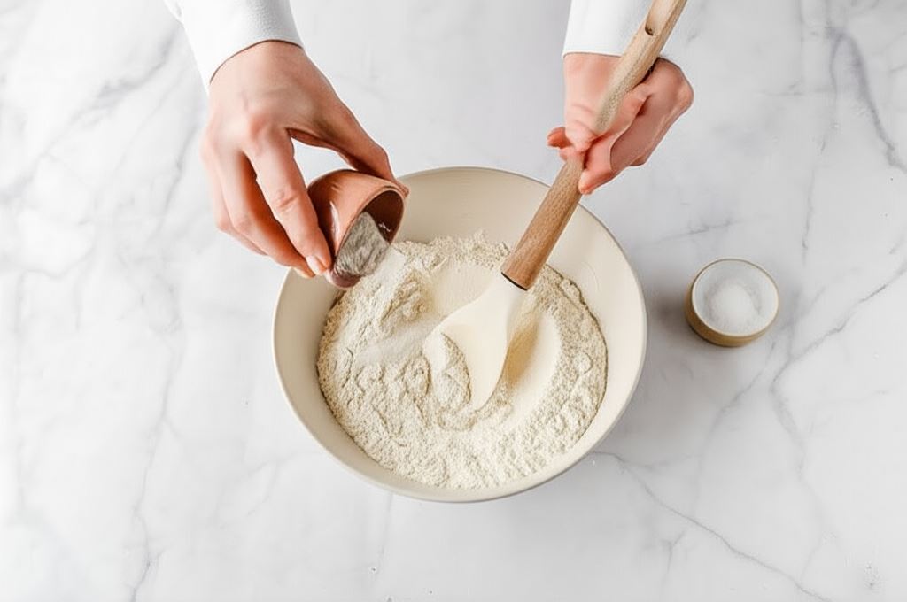 Przesiewamy mąkę do miski. Wsypujemy proszek do pieczenia i sól. Mieszamy wszystko starannie.