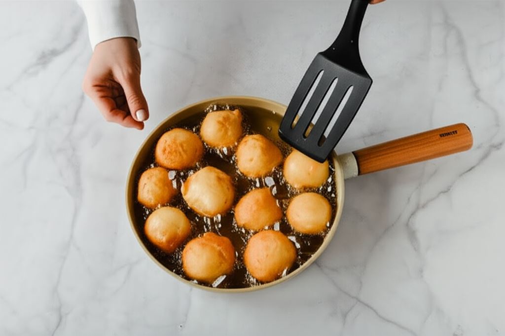 Rozgrzewamy olej na patelni. Nabieramy porcję ciasta przy użyciu łyżki. Możemy nawilżyć dłonie olejem, wtedy będzie nam prościej formować kulki z ciasta.