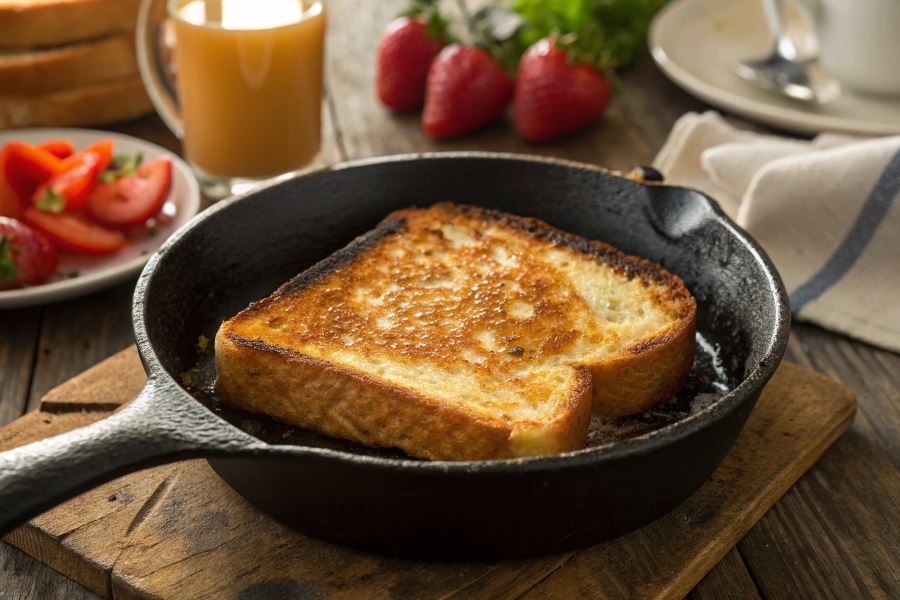 - Przeładowanie patelni – układanie zbyt wielu kromek jednocześnie obniża temperaturę i powoduje nierównomierne smażenie