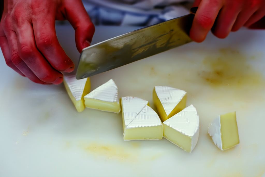 Camembert przekrój na połowę, a następnie każdą z połówek podziel na trzy trójkątne kawałki.