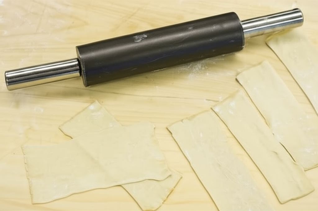 Zdejmij folię z parówek, ciasto francuskie lekko rozwałkuj i potnij wzdłużnie nożem na 12 części.