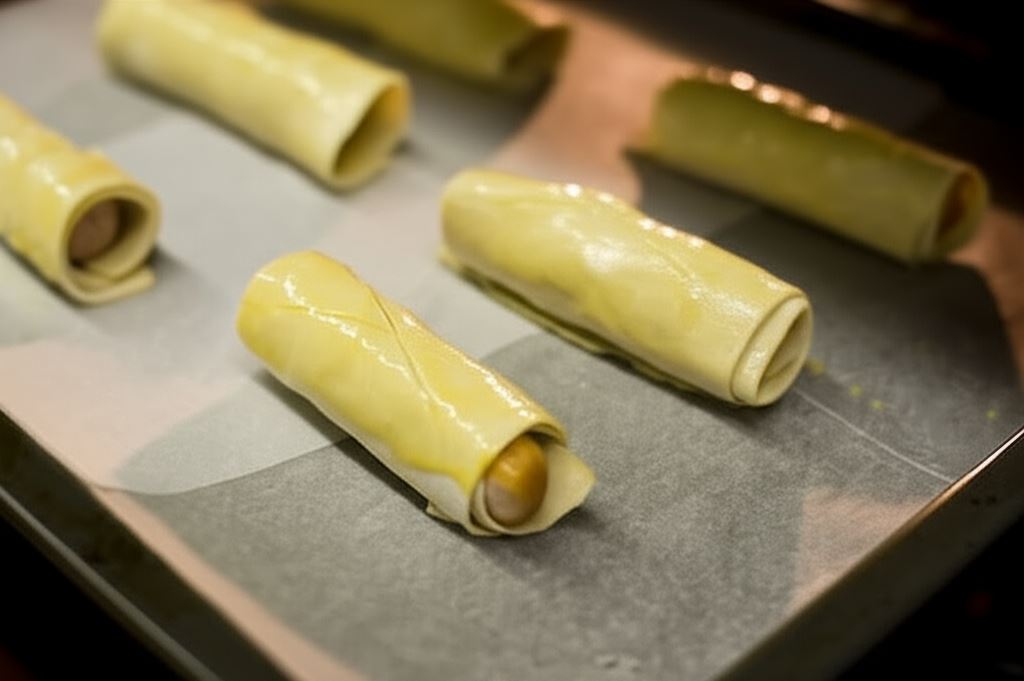 Nacinanie ciasta francuskiego przed pieczeniem to kluczowy krok, który zapobiega wybrzuszaniu się parówek pod wpływem wysokiej temperatury. Dodatkowo, posmarowanie ciasta roztrzepanym jajkiem nie tylko nada mu apetycznego złotego koloru, ale również sprawi, że będzie bardziej chrupiące i smaczne.
