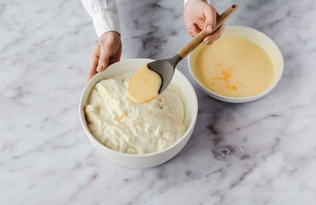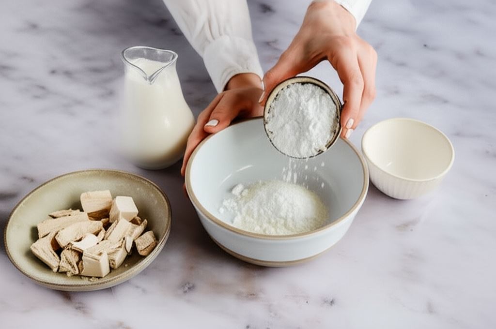 Do naczynia wsypujemy 2 łyżki mąki, 2 łyżki cukru pudru i rozdrobnione drożdże. Wszystko zalewamy 100 ml ciepłego mleka. Mieszamy, aż masa stanie się jednolita. Odkładamy w ciepłe miejsce do wyrośnięcia.