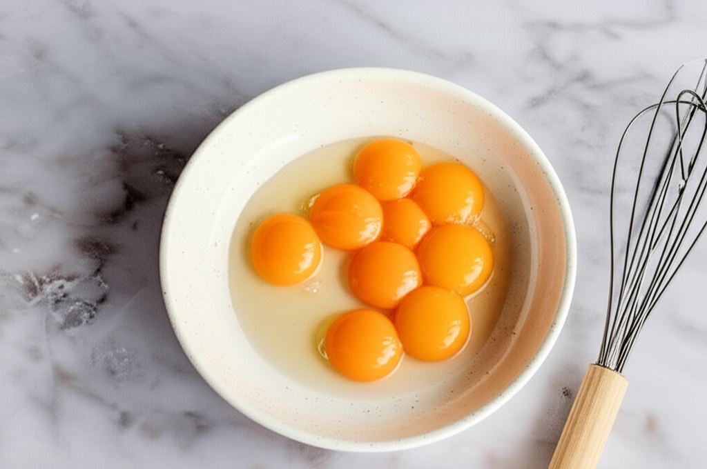 Do oddzielnej miski wbijamy żółtka (białka nie będą nam potrzebne). Ucieramy je z resztą cukru oraz cukrem wanilinowym na puszystą masę.