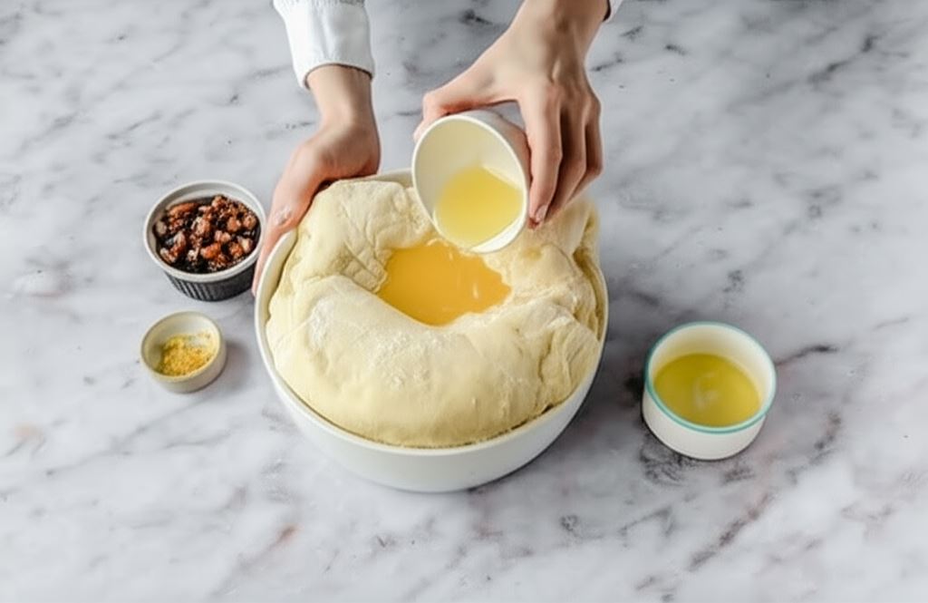 Do wyrośniętego ciasta wsypujemy stopione masło, olej słonecznikowy oraz startą skórkę z cytryny. Znów zagniatamy i odkładamy do wyrośnięcia.