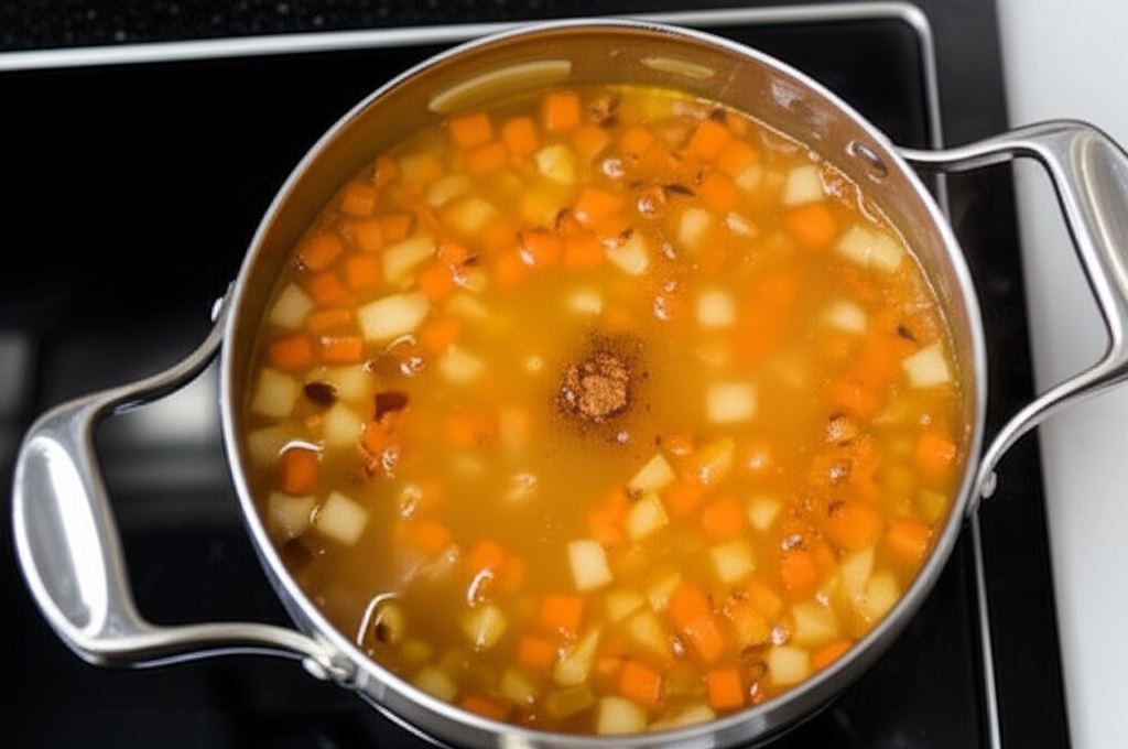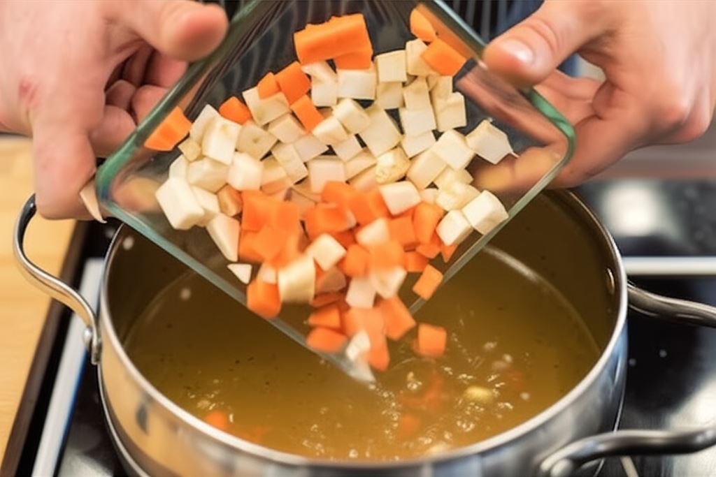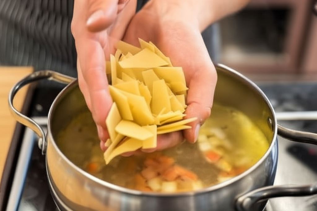 Makaron do lasagne połam na mniejsze części, wsyp wraz z mieszanką Knorr Naturalnie smaczne do wrzącej zupy. Całość dokładnie wymieszaj i gotuj jeszcze przez około 12 minut, aż makaron stanie się miękki.